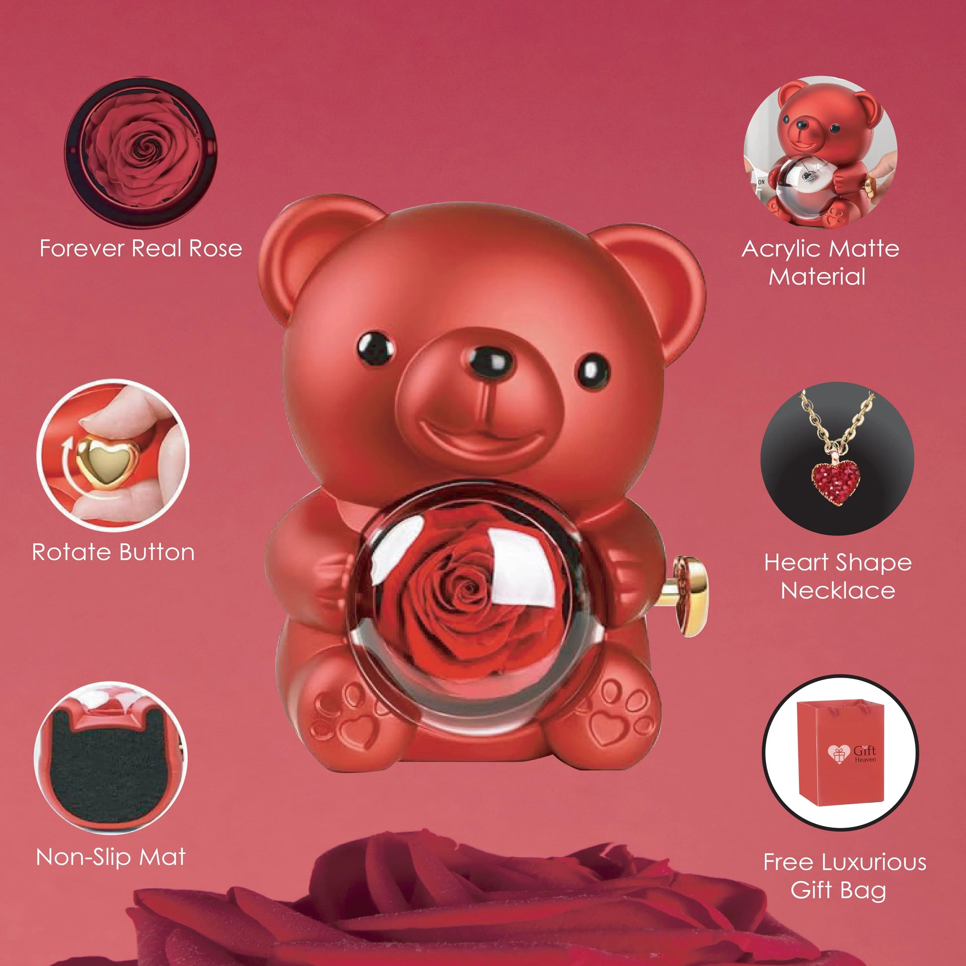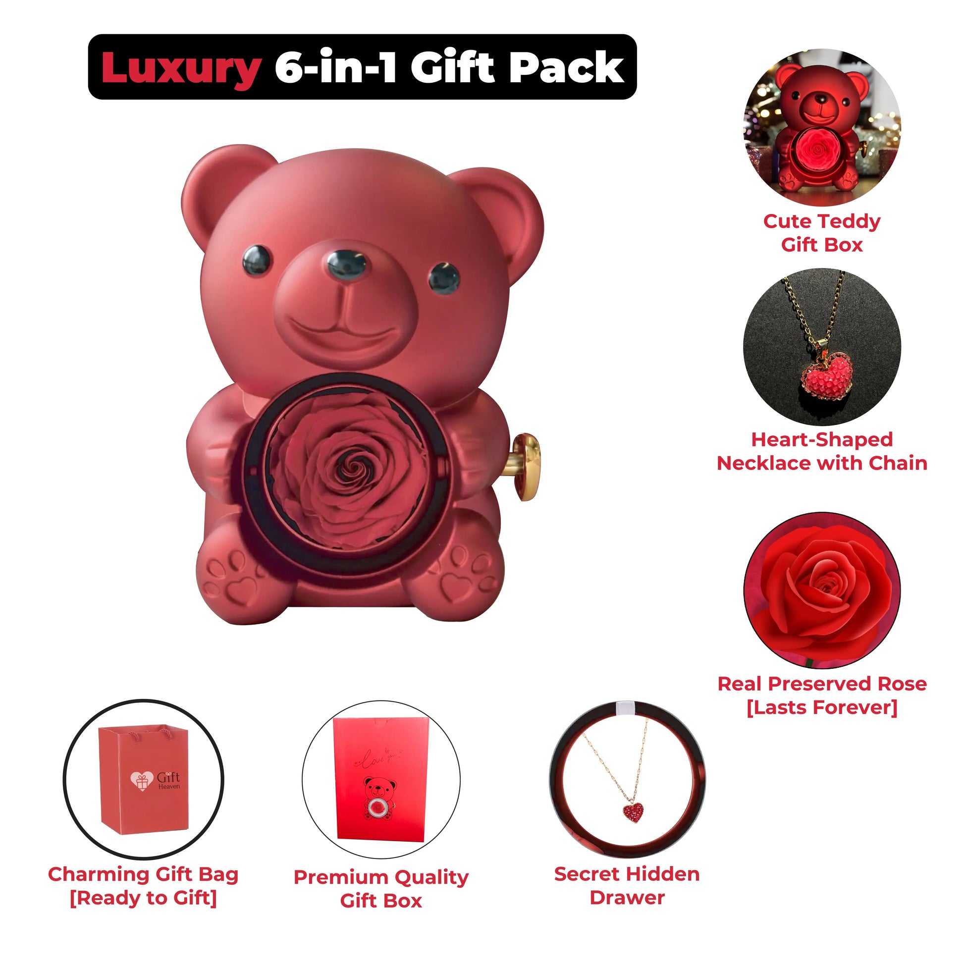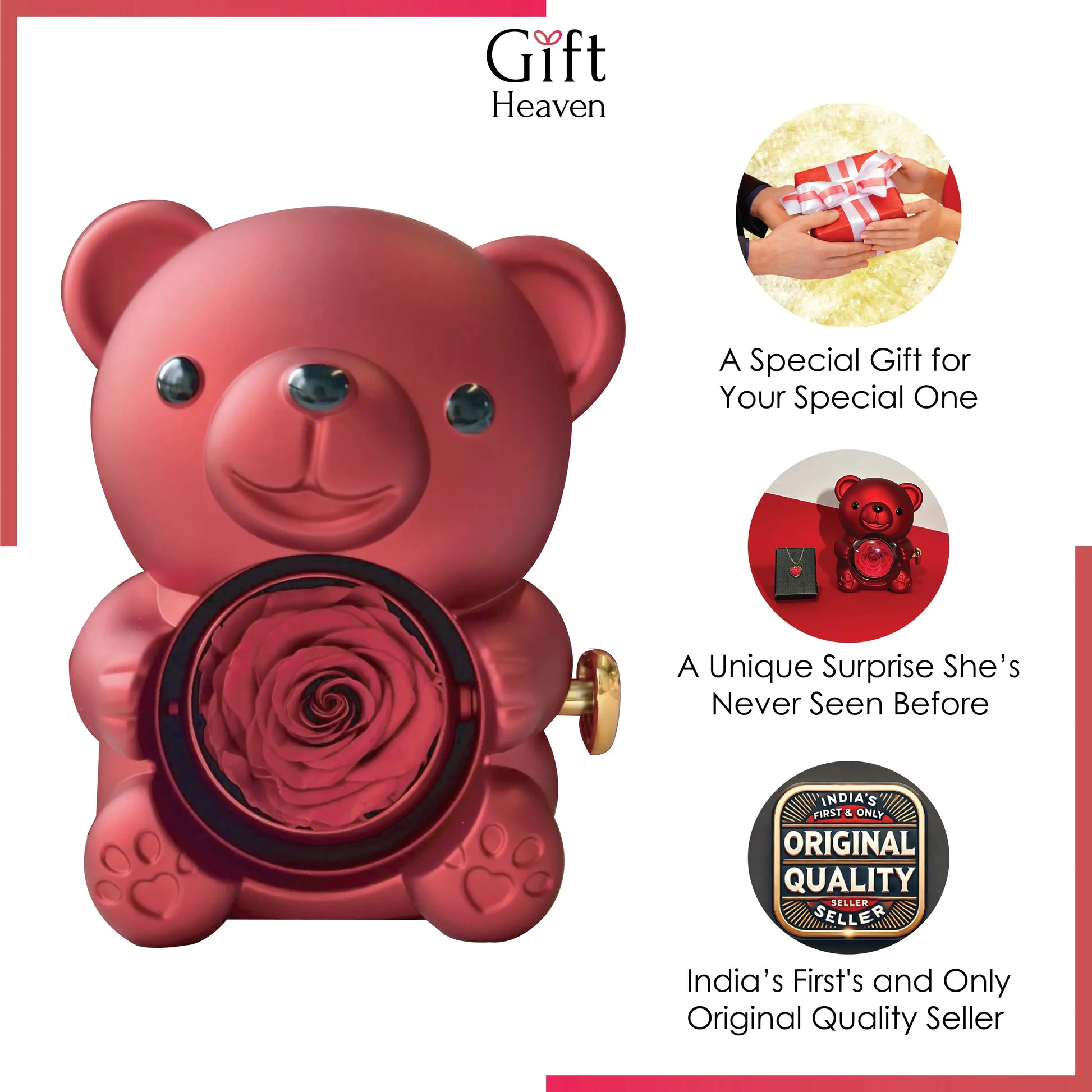 She’ll first see the adorable teddy, but the real surprise is inside. Rotate it to reveal a hidden drawer with a dazzling heart necklace and a real preserved rose. 🌹